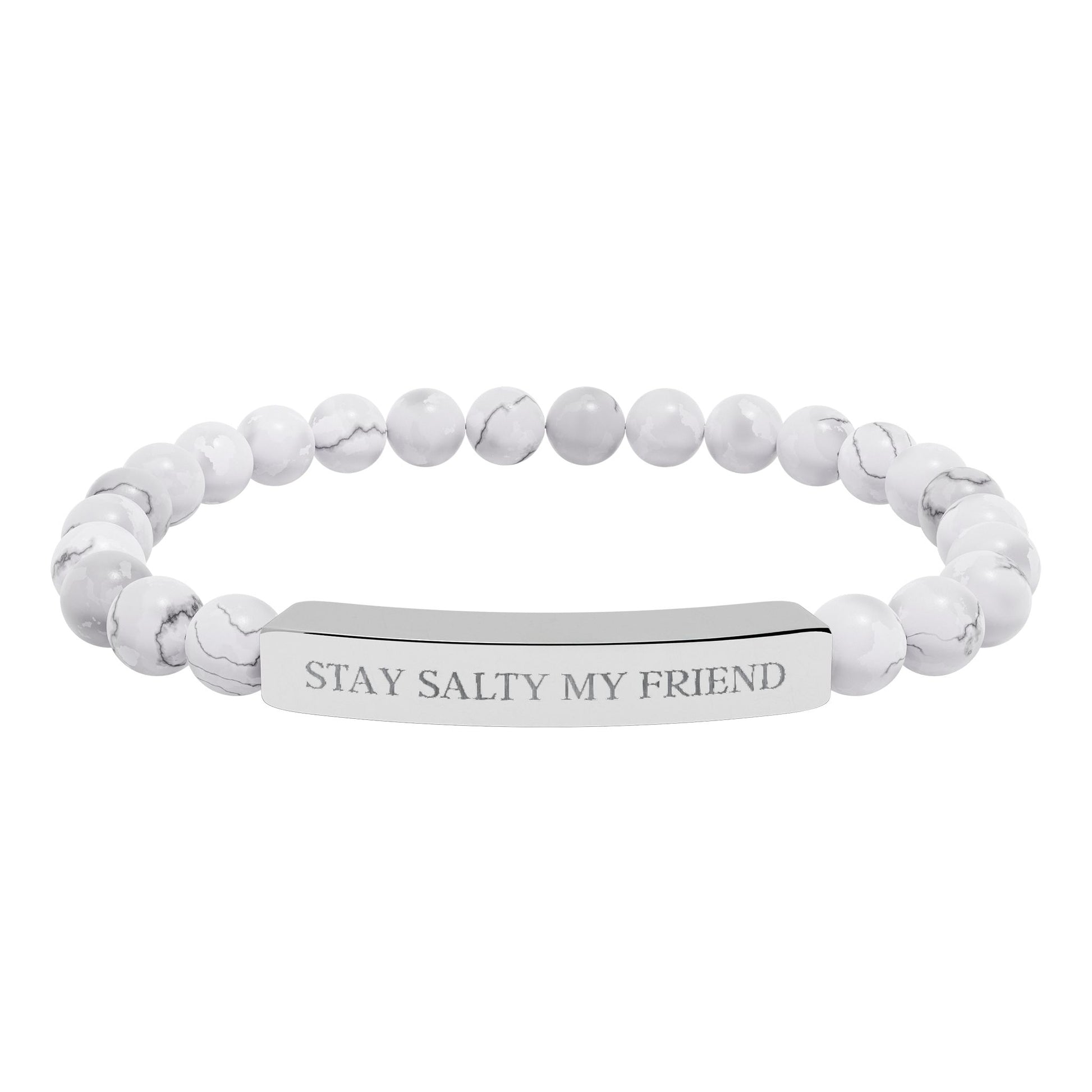 A gentle stretch bracelet that pairs natural stone beads with a slim engraved stainless steel bar. Smooth, round stones in soft neutral tones sit on a durable elastic cord for easy wear; the polished 316L stainless steel bar carries a crisp, permanent engraving for a subtle personal touch. Lightweight and snug, it slips on comfortably and layers easily with other pieces. Packaged in a white gloss jewelry box with non-tarnish cotton fiber, it arrives ready to give or keep as a quiet reminder worn every day.
