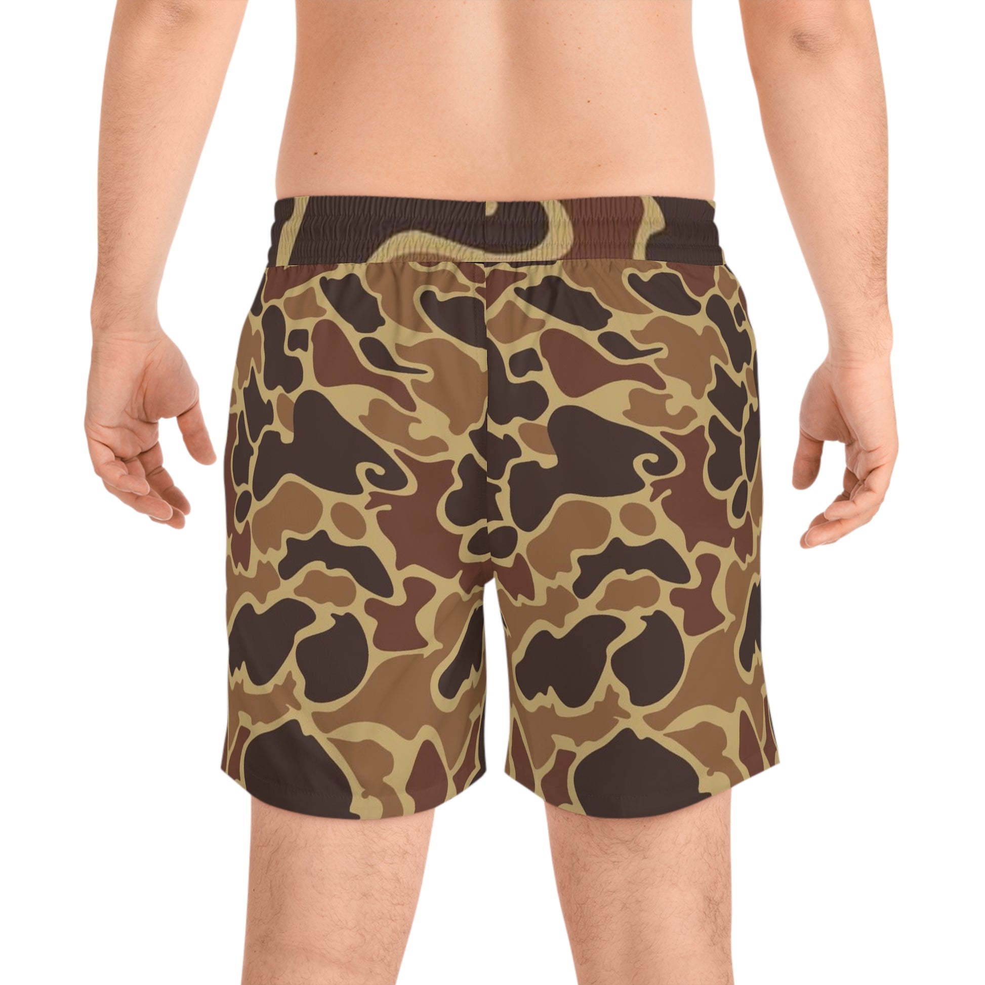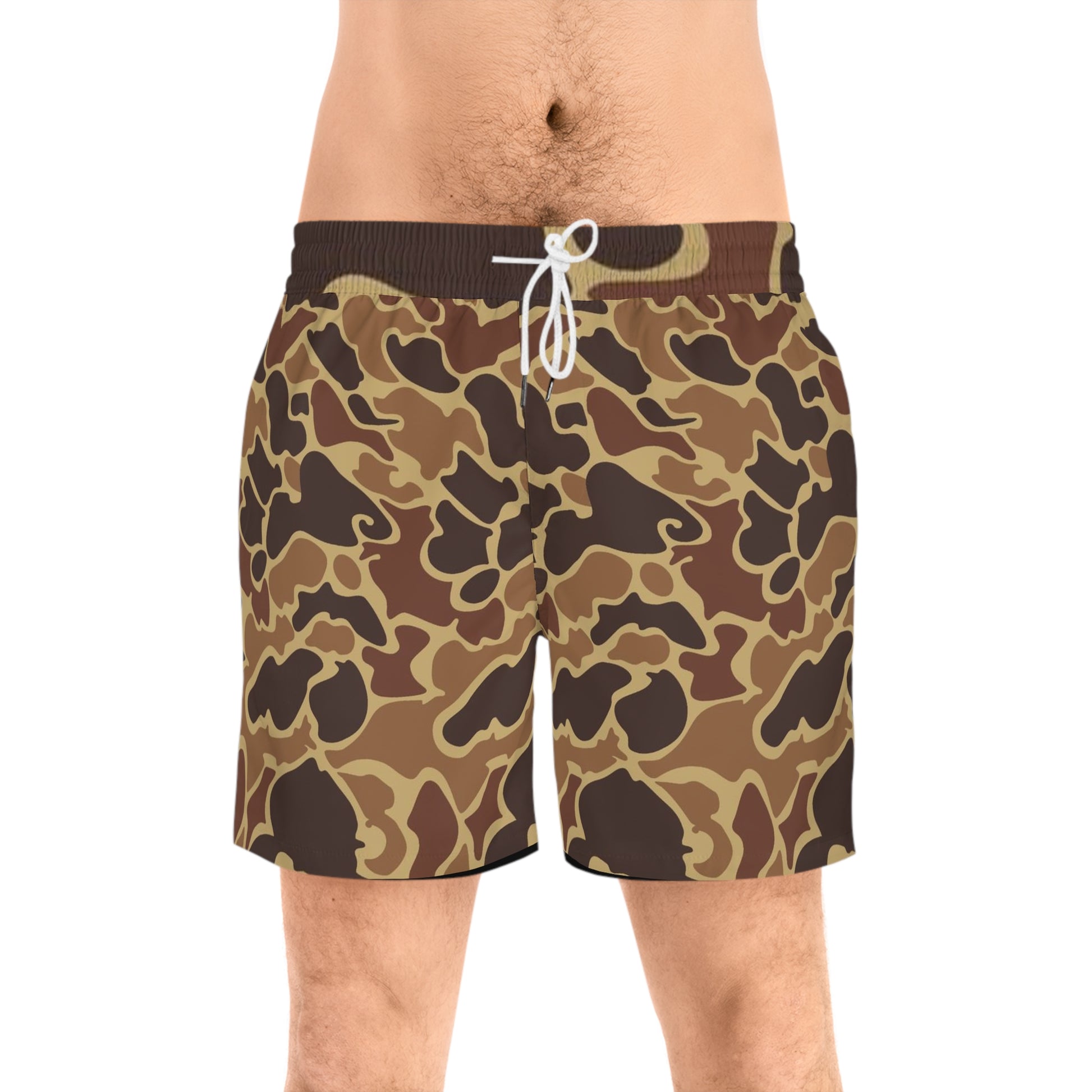 These mid-length swim shorts carry a sun-worn camo that feels rugged and easygoing. Lightweight polyester with a touch of spandex moves with you, while the inner mesh brief and elastic waistband keep everything comfortable and secure. Two side-entry pockets hold small essentials between the waves and the trail. The brown and tan camouflage pattern blends into summer outings — from lakeside afternoons to backyard barbecues — with a relaxed, outdoorsy energy.