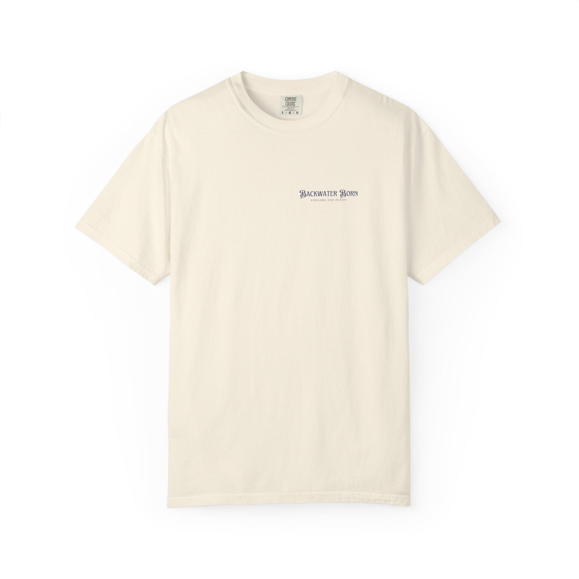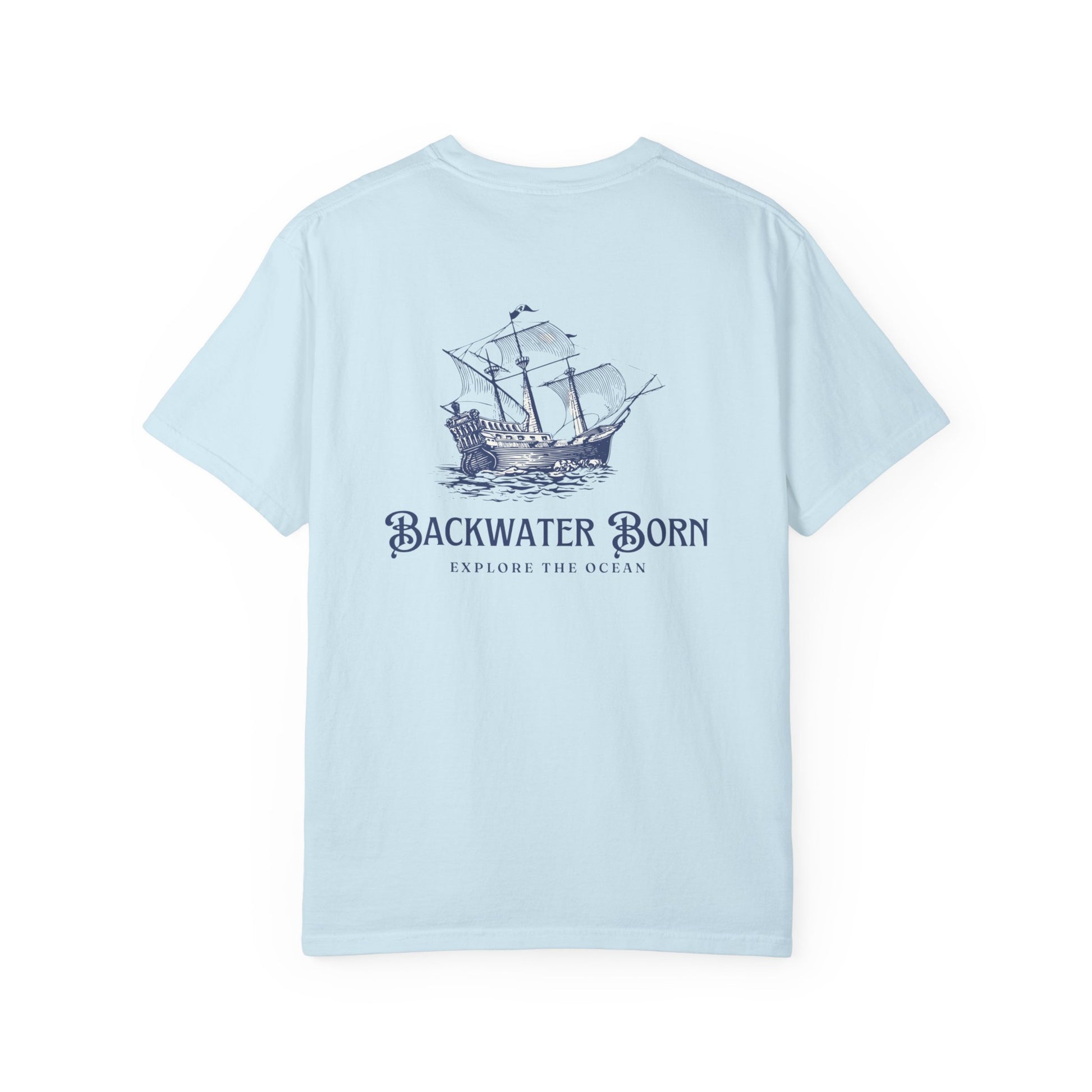 This heavyweight garment-dyed T-shirt carries the hush of salt air and the slow rhythm of an old ship cutting through blue water. The front wears a small, whispering logo over the heart; the back shows a finely detailed sailing ship and the words “Backwater Born — Explore the Ocean,” rendered like an heirloom etching. It’s built to soften with every wash, the fabric giving way to memory and summer evenings on a porch or a crowded harbor dock. The relaxed fit and substantial 100% ring-spun cotton drape casually over shorts or jeans. Wear it when you want to feel rooted in coastline stories — quiet, sturdy, and ready for whatever tide comes in.
