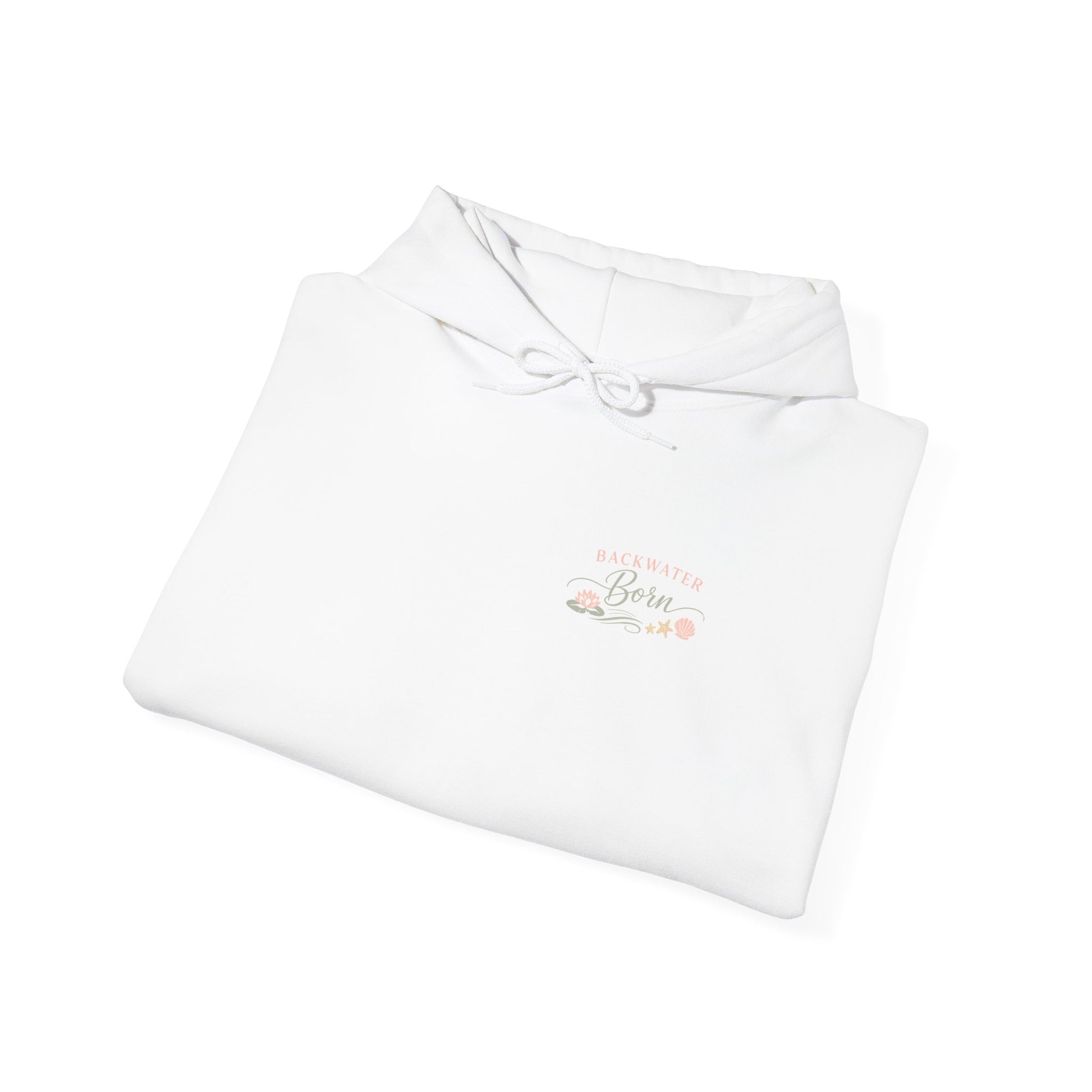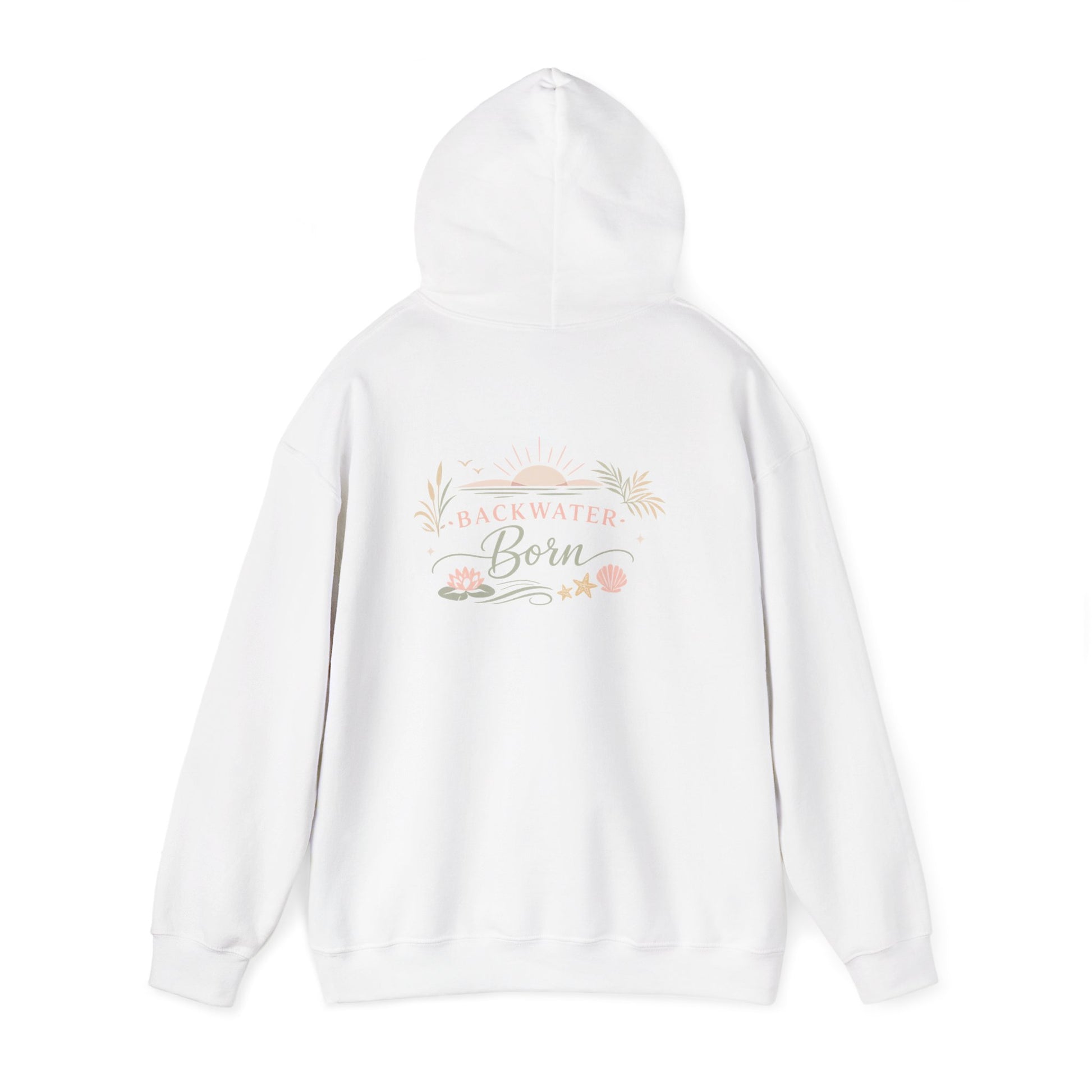 This cozy hoodie carries a gentle, sunlit vibe — soft cream fabric with a delicate pastel design that reads like an intimate postcard from slow mornings. The artwork sits small on the chest and blooms across the upper back: a hand-drawn sun, rustic foliage, and warm script that says "Backwater Born," evoking riverbanks, quiet dawns, and days that move at a calm pace. It feels like wrapping yourself in a familiar place: thick enough to hold warmth on chilly walks, light enough to lean into layered outfits. Wear it to watch the sunrise, to pack for a weekend cabin trip, or simply to make everyday errands feel a little more serene.