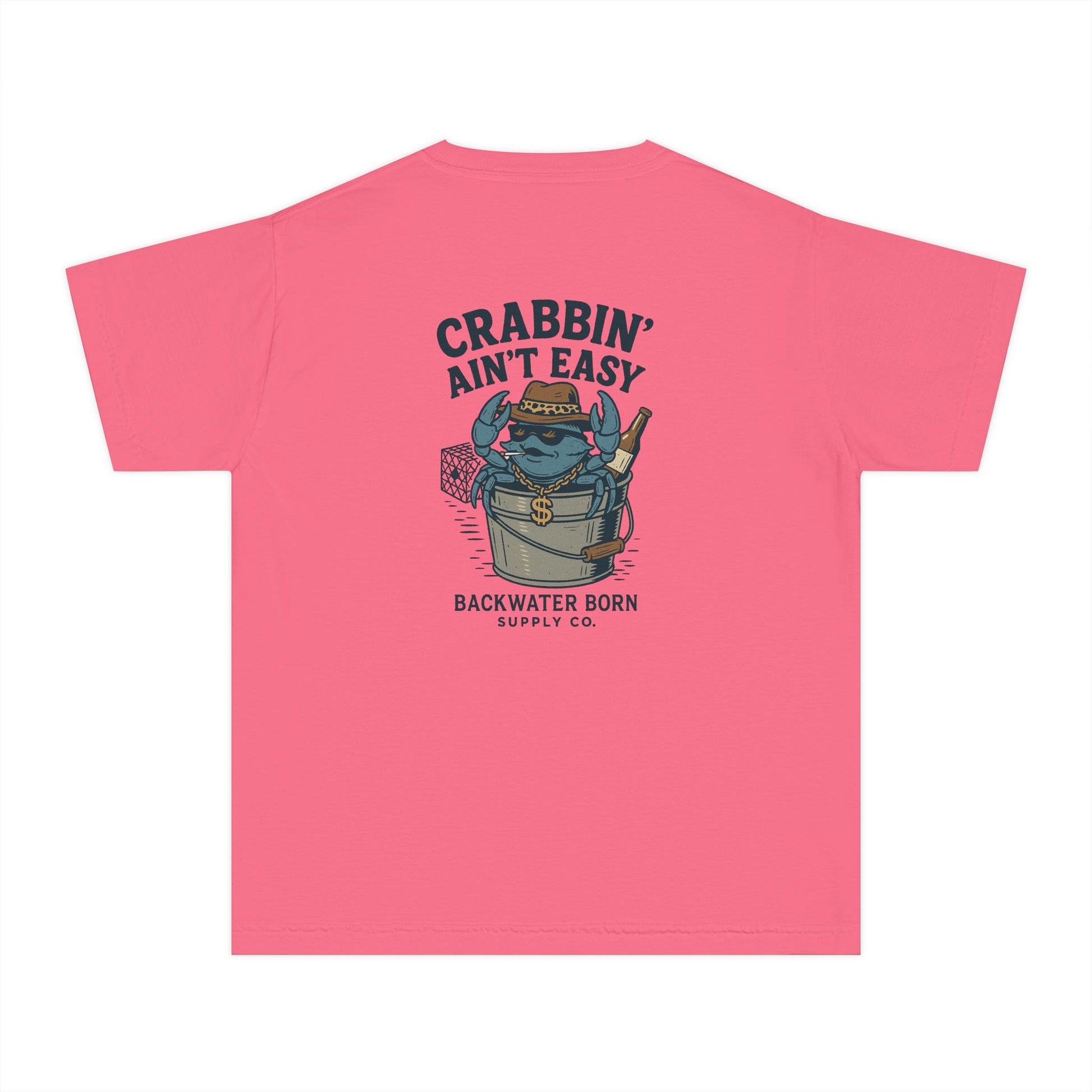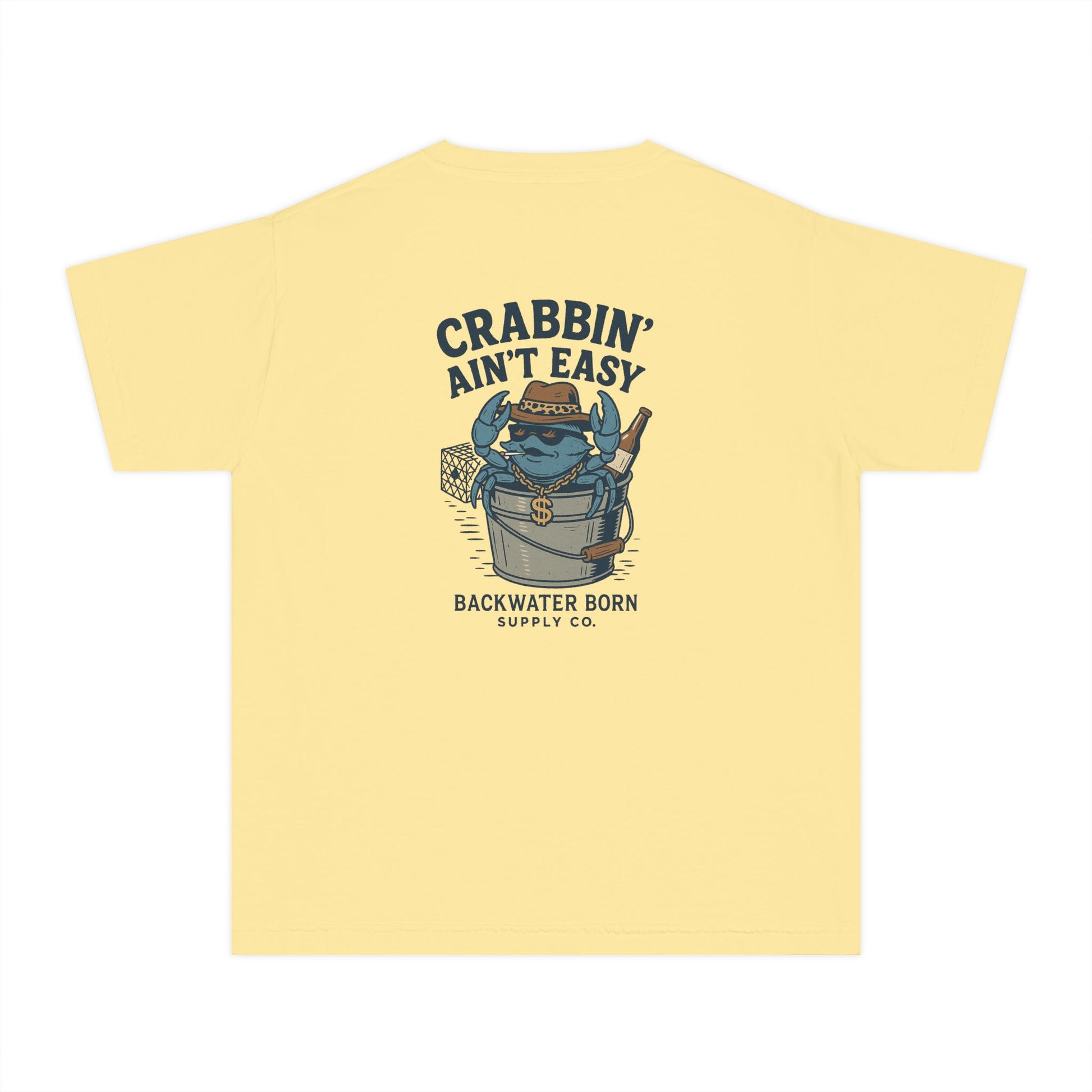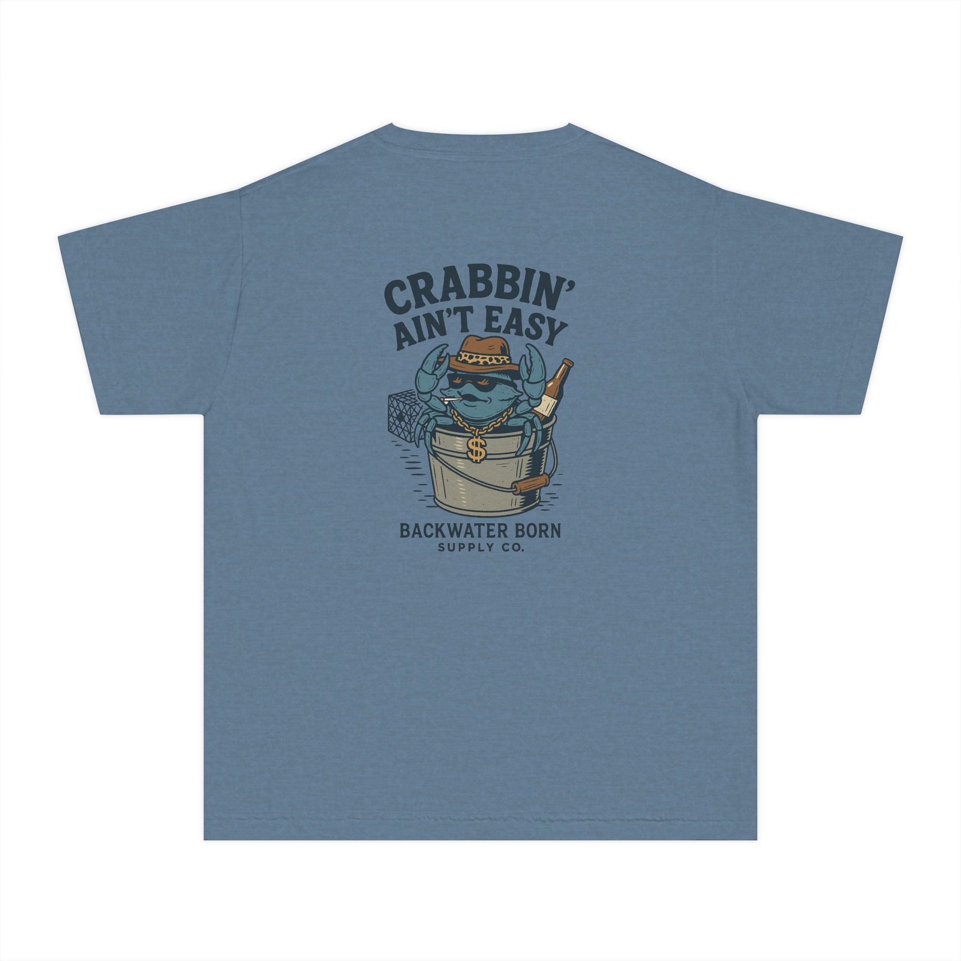 Soft, sun-washed tee made for kids who live for low-tide adventures and sandy pockets. The front keeps things simple with a small backwater logo over the heart, while the back bursts with a cheeky crab illustration and the slogan “Crabbin’ Ain’t Easy.” It feels lived-in from the first wear — the garment-dyed cotton gives a mellow, broken-in color and a soft hand. Built to take tumbles, the shirt’s double-stitched seams and neck-and-shoulder tape keep shape through long beach days and backyard explorations. Casual, roomy, and ready for muddy boots, this tee slides into family outings, seaside scavenger hunts, and lazy summer evenings at the pier.