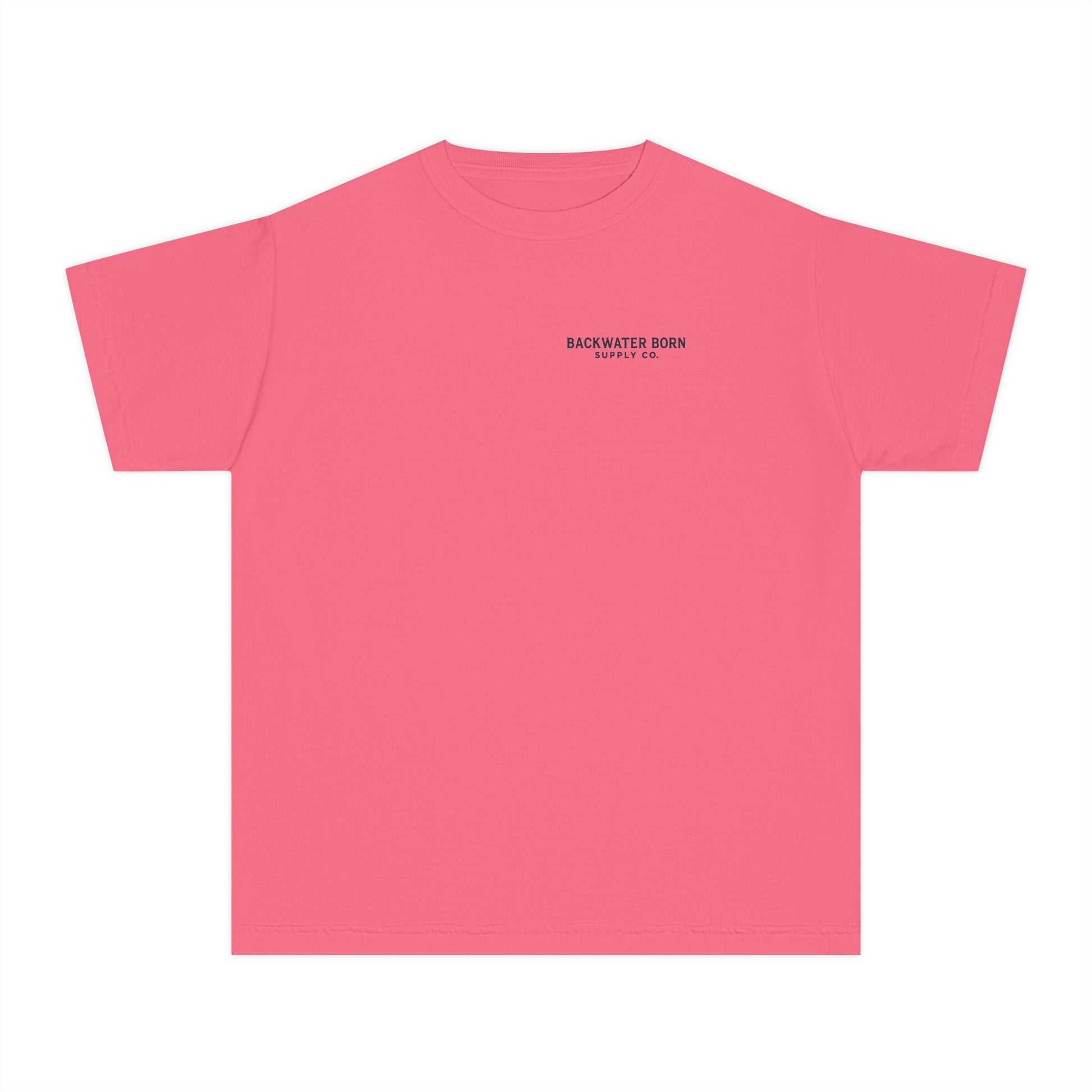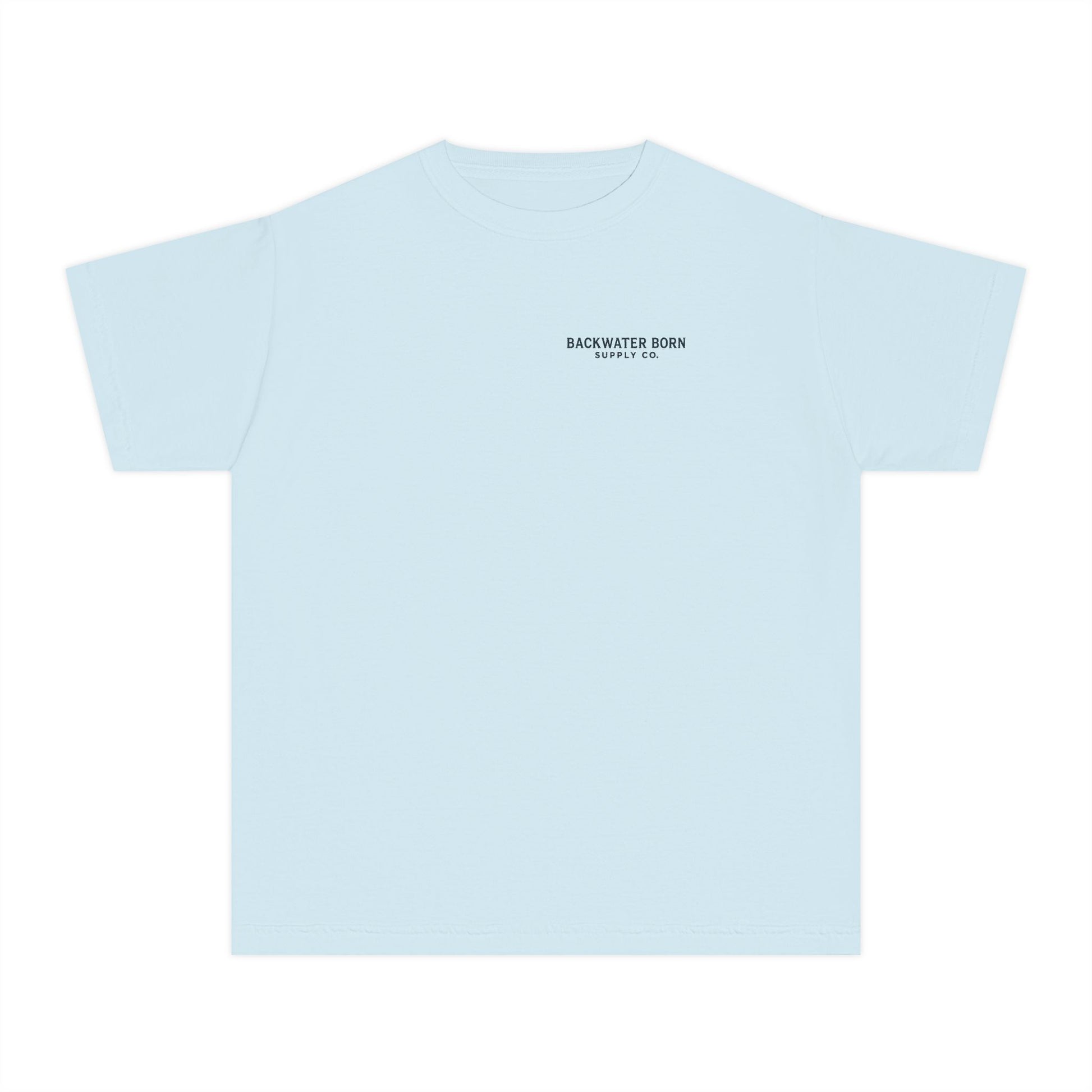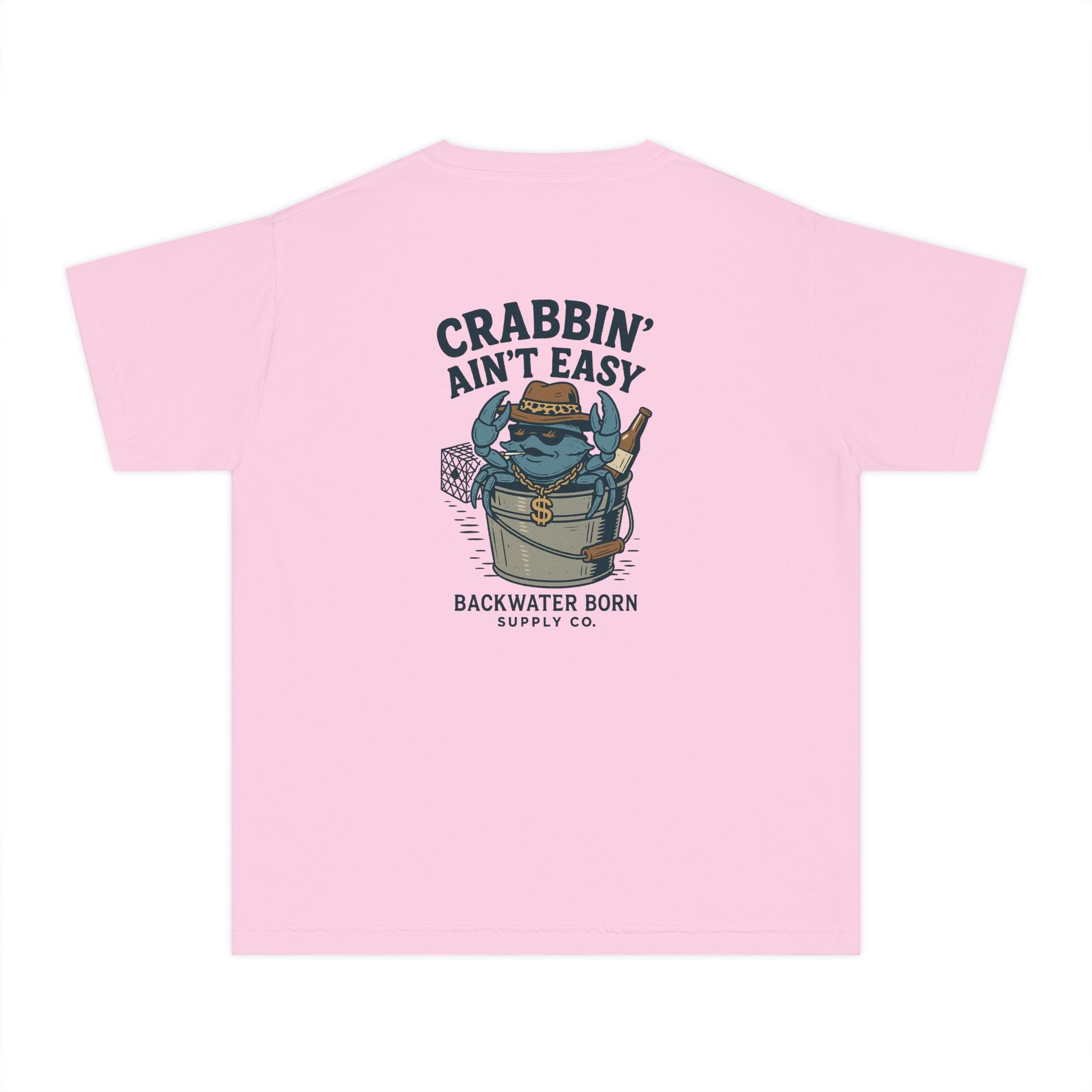 Soft, sun-washed tee made for kids who live for low-tide adventures and sandy pockets. The front keeps things simple with a small backwater logo over the heart, while the back bursts with a cheeky crab illustration and the slogan “Crabbin’ Ain’t Easy.” It feels lived-in from the first wear — the garment-dyed cotton gives a mellow, broken-in color and a soft hand. Built to take tumbles, the shirt’s double-stitched seams and neck-and-shoulder tape keep shape through long beach days and backyard explorations. Casual, roomy, and ready for muddy boots, this tee slides into family outings, seaside scavenger hunts, and lazy summer evenings at the pier.